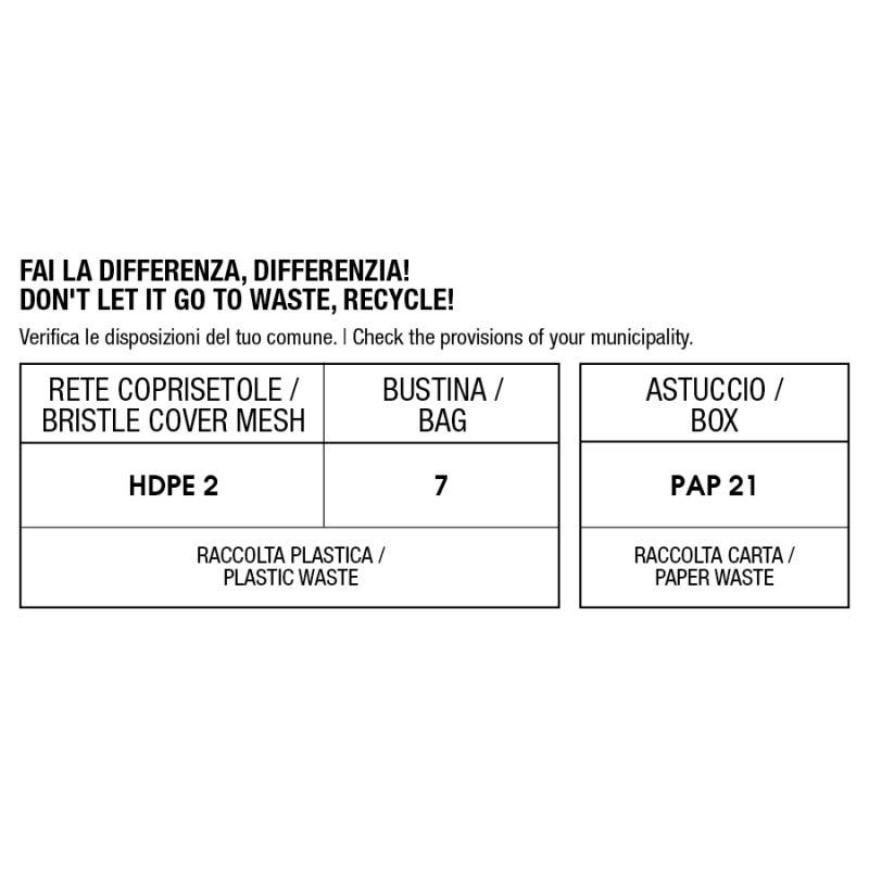 Utilizzo professionale - Setole anti-rottura - Fibre sintetiche anti-batteriche - 100% cruelty-free - Vegan - Forma ergonomica - Peso bilanciato - Elevata sensorialità - Packaging eco-sostenibile
