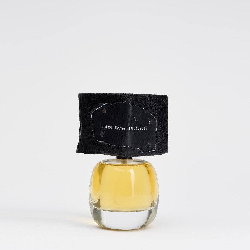 Come sempre, particolare attenzione è data al packaging: il tappo del flacone è un monolite di legno bruciato, ad evocare il tragico momento dell’incendio, sul quale è inchiodato il nome della fragranza.