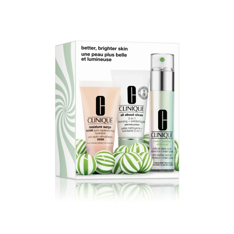 Set composto da Even Better Clinical Radical Dark Spot Corrector & Interruptor 30 ml,All About Clean 2-in-1 Cleansing + Exfoliating Jelly 30 ml,Moisture Surge 100-H Auto-Replenishing Hydrator 30 ml.