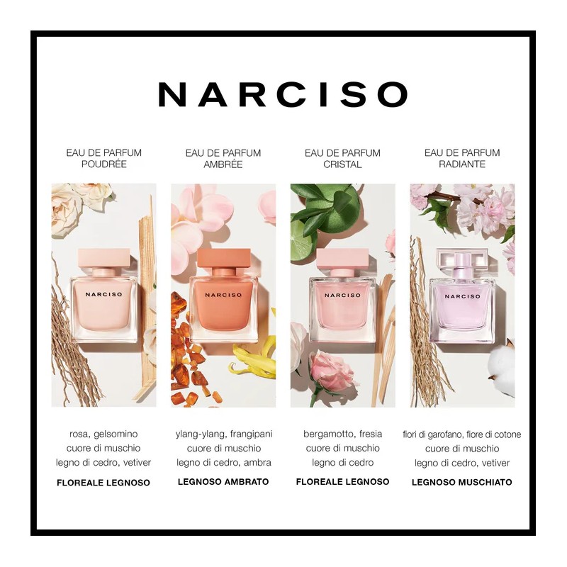 Narciso eau de parfum Radiante è una fragranza vibrante dell'iconica collezione Narciso, che avvolge chi la indossa con un'essenza luminosa e morbida.
