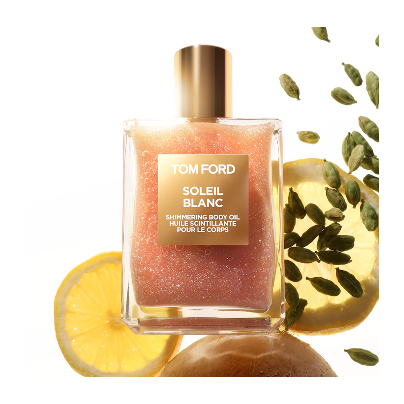 Oltre alla fragranza, Tom Ford Soleil Blanc offre anche un olio illuminante per il corpo che dona un effetto seducente alla pelle, come se fosse stata baciata dal sole tutto l'anno. Questo olio leggero e vellutato contiene riflessi d'oro e di platino che aggiungono un tocco di lusso all'abbronzatura e alla carnagione naturale della pelle.