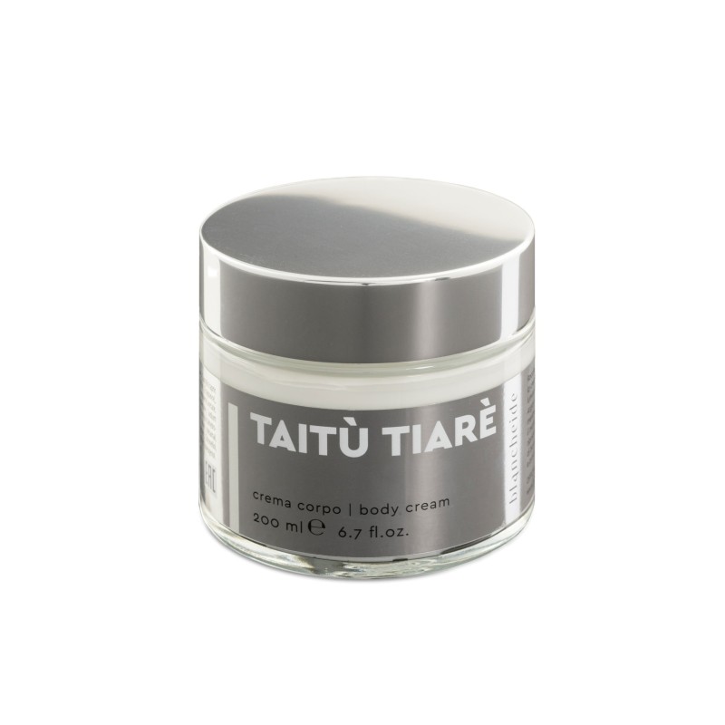 Racchiusa in un elegante contenitore di vetro, la crema corpo Taitù Tiaré lascia la pelle morbida, luminosa e profumata.