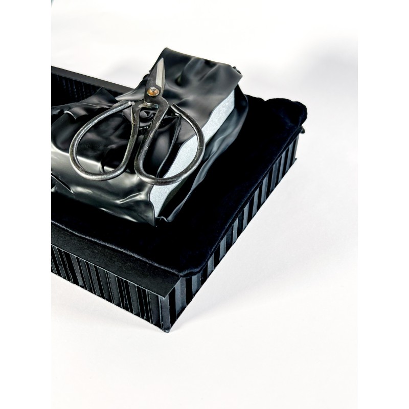 Il flacone anch’esso argento invece è riposto in un “sordo” sacchetto di velluto nero, sigillato da una guaina termoretraibile, che deve essere materialmente tagliato utilizzando le forbici metalliche presenti all’interno della scatola.